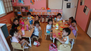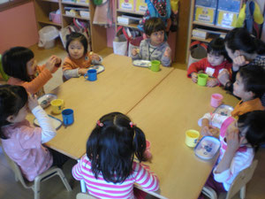 朝のおやつの時間です。クラッカーとミルクなど胃腸の動きを活発にし、ランチがしっかり食べられるようにするためのスナックです。手洗いもきちんとし、みんな一緒に”Thank you for our food いただきまーす!”